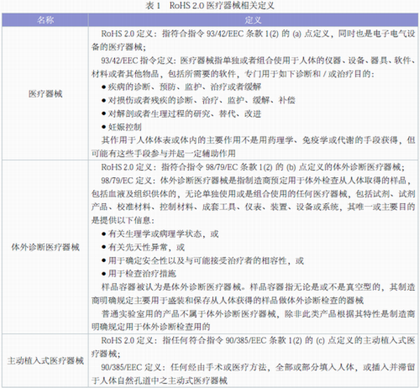 第8類監測和控制設備以及第11類其他未在10大類內的電子電氣設備,并對新納入管控的設備給予一定的緩沖期。其中醫療器械需從2014 年7 月22 日起執行相關要求,體外診斷醫療器械自2016 年7 月22日起執行,豁免主動植入式醫療器械。新指令中醫療器械相關定義見表1。
