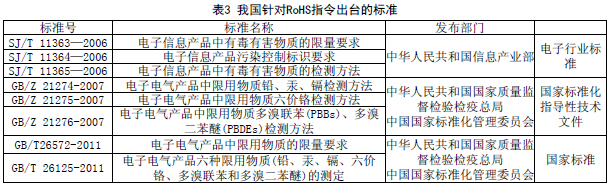 RoHS指令出臺(tái)后,國(guó)際電工委員會(huì)(IEC)針對(duì)該指令出臺(tái)了相對(duì)應(yīng)的檢測(cè)方法——IEC62321 Electrotechnical products-Determination of levels of six regulated substances(lead,mercury,cadmium,hexavale nt chromium,polybrominated biphenyls, polybrominated diphenyl ethers)(電子電氣產(chǎn)品-測(cè)定六種限制物質(zhì)(鉛,汞,鎘,六價(jià)鉻,多溴聯(lián)苯,多溴聯(lián)苯醚)的濃度)。如表3揚(yáng)塵我國(guó)也針對(duì)RoHS指令出臺(tái)了一系列的指導(dǎo)方法。