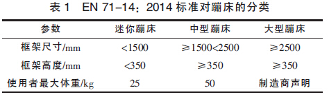 本標準重點關注了蹦床進入方式的安全和蹦床圍欄的安全性能和蹦床的牢固強度。該標準不適用于: 用于體操運動的蹦床、充氣蹦床、公共場所娛樂蹦床、斜墊蹦床、醫療蹦床、帶有附加功能(如籃球框) 的蹦床、家用但埋于地面的蹦床。本標準按照蹦床的尺寸和使用者的最大體重把蹦床分成了3類,如表1 所示: