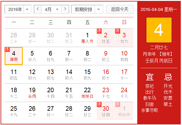 2016清明節放假時:201642——44周六周日周一共三天