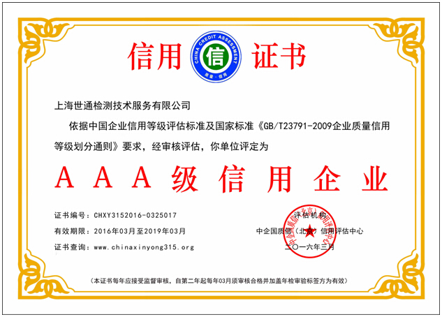 恭賀上海世通檢測被評為3A級信用企業