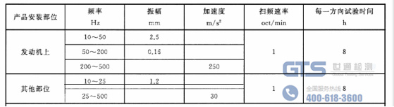 GB/T18488-2015電動汽車用驅動電機系統分為兩個部分:第一部是技術條件規范,第二部分是測試方法。該標準下振動測試要求兩種振動模式試驗:掃頻振動和隨機振動。 無論世是哪種振動測試,振動具體條件和嚴酷等級選擇都與產品在整車上的安裝部位有關。掃頻振動試驗的具體要求如下: