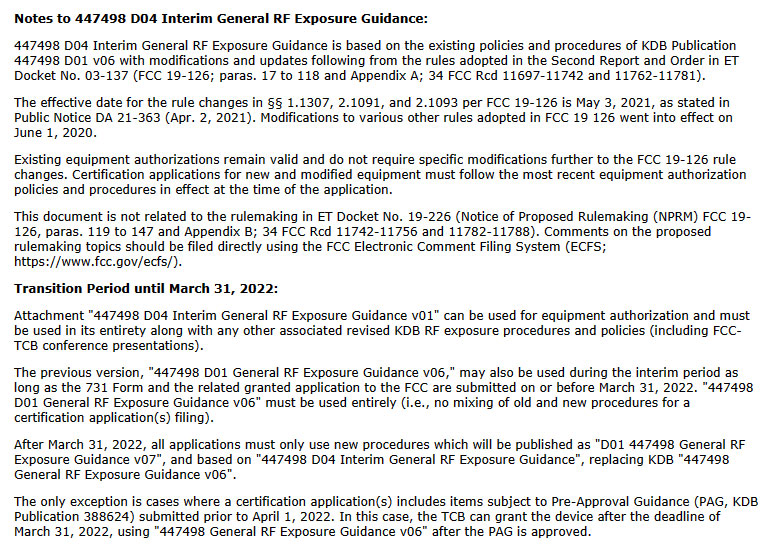 FCC認證官網于2021年11月29日發布了KDB 447498 D04新版本使用指導,這是一則過渡期的射頻暴露指導文件。