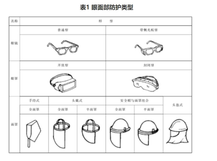 眼面部防護用品種類很多,依據防護部位和性能,分為眼鏡、眼罩和面罩三種(見表1)。防護眼鏡(簡稱護目鏡)是在眼鏡架內裝有各種護目鏡片,防止不同有害物質傷害眼睛的眼部防護具,如防沖擊、輻射、化學藥品等防護眼鏡。防護眼鏡按照外形結構分為普通型、帶側光板型、開放型和封閉型。面罩是防止有害物質傷害眼面部(包括頸部)的護具,分為手持式、頭戴式、全面罩、半面罩等多種形式。