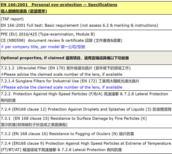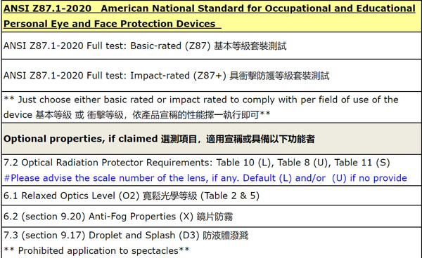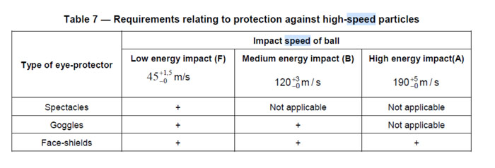 例如7.2.2 Protection Against High-Speed Particles(F/B/A)高速撞擊&7.2.8 Lateral Protection側向防護,這個標準對應撞擊的等級是由眼面部防護用品防護部位和性能決定的,可參考表7: