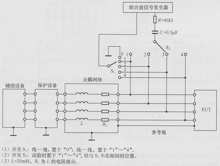 h.  浪涌要加在線一線和線一地之間。如果無特殊規定,則浪涌應遂次加在每一根線與地之間,有時組合波形發生器要同時測試兩根或多根線對地情形,這時脈沖持續期可允許減