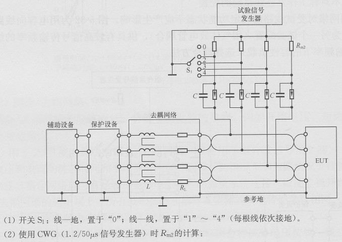 浪涌經電容耦合網絡加到EUT電源端上,為了避免對由同一電源供電的非UET產生不利影響,需要使用去耦網絡,以便為浪涌波提供足夠的去耦阻抗,使得能在受試線路上形成規定的波形。為模擬典型輞合阻抗,在某些情況下,試驗時必須使用附加的規定電阻。